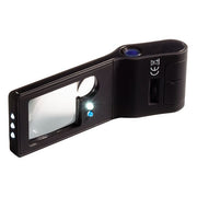 Praktiskt multifunktionellt förstoringsglas med ett praktiskt LED-mikroskop (15x förstoring) för en detaljerad titt på dina samlarföremål. Dessutom garanterar 2 asfäriska linser gjorda av akrylglas (stor lins 3x förstoring, liten lins 10x förstoring) bästa bildprestanda. Mångsidig tack vare 3 extra belysningsfunktioner: 3 högteknologiska lysdioder (fackla), 1 långvågig UV-lampa för kontroll av sedlar och frimärken, och 1 vitt ljus-LED för starkt infallande belysning för att undersöka dina samlarföremål, även under dåliga ljusförhållanden . Objektivmått: 30 x 37 mm (stor) eller Ø 15 mm (liten). Batteridriven med 3x LR1130 (AB10) (inkl.). Svart plastfodral. Yttermått (B/L/H): 39 x 115 x 19 mm. Inklusive en skyddsväska av konstläder.